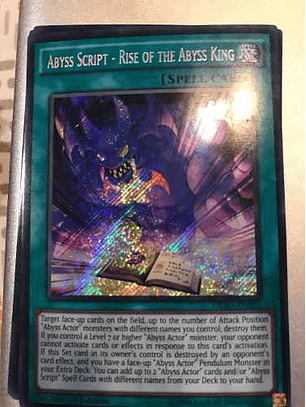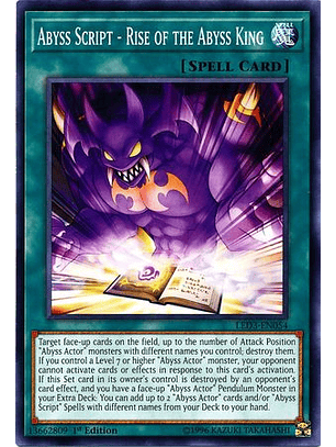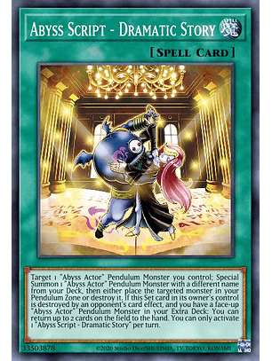 Puedes Sacrificar 1 monstruo "Actor del Abismo", y después seleccionar 1 Mágica "Guión de Abismo" en tu Cementerio; Colócala en tu Campo. Puedes usar este efecto de "Guión de Abismo - Abismiento" hasta dos veces por turno. Si esta carta Colocada controlada por su dueño es destruida por el efecto de una carta de tu adversario, y tienes un Monstruo de Péndulo "Actor del Abismo" boca arriba en tu Deck Extra: puedes Invocar de Modo Especial, desde tu Deck, cualquier cantidad de Monstruos de Péndulo "Actor del Abismo".