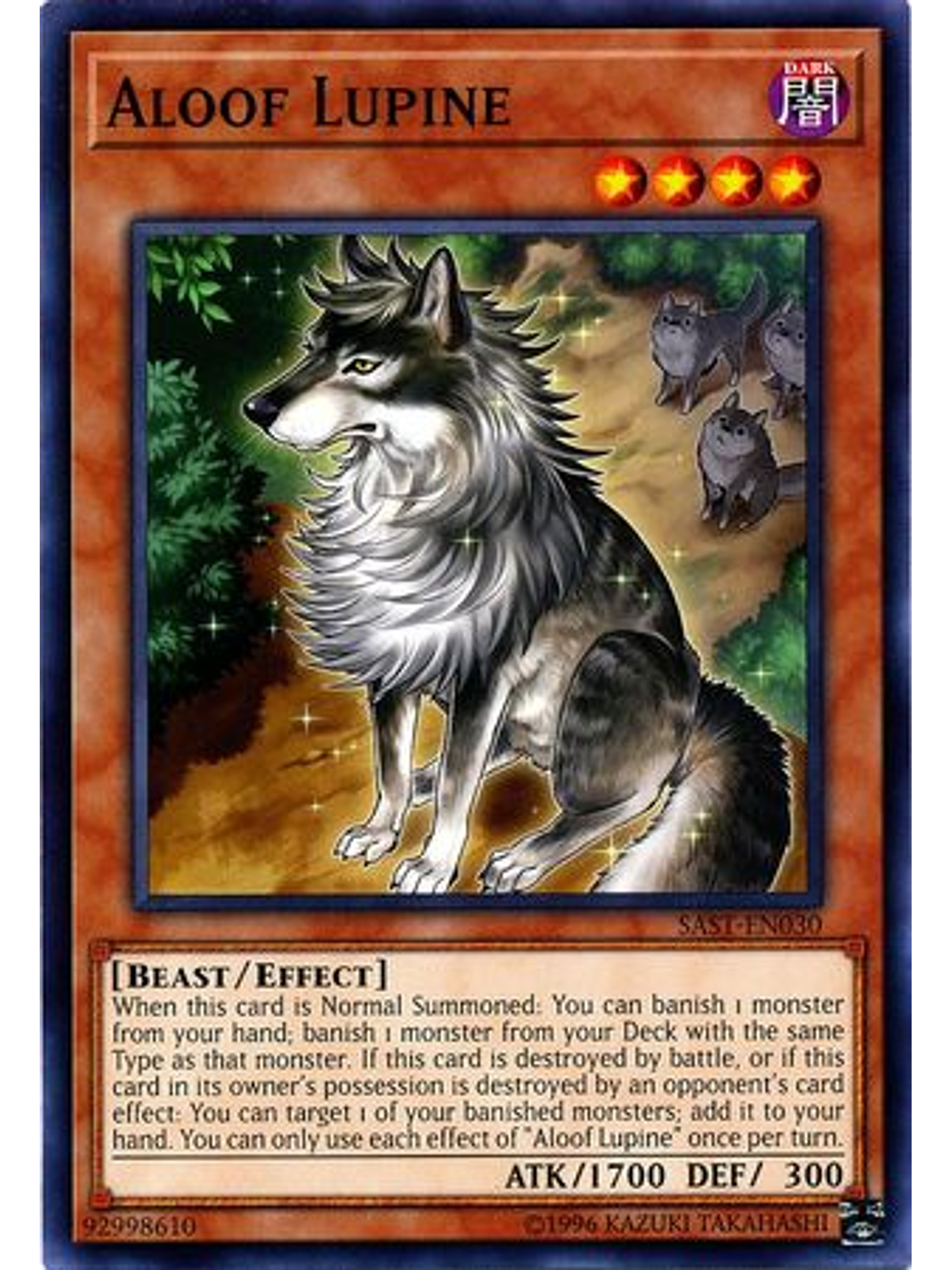 Cuando esta carta es Invocada de Modo Normal: puedes desterrar 1 monstruo en tu mano; destierra 1 monstruo en tu Deck con el mismo Tipo que ese monstruo. Si esta carta es destruida en batalla, o si esta carta en posesión de su dueño es destruida por el efecto de una carta del adversario: puedes seleccionar 1 de tus monstruos desterrados; añádelo a tu mano. Sólo puedes usar cada efecto de "Lobuno Lejano" una vez por turno.