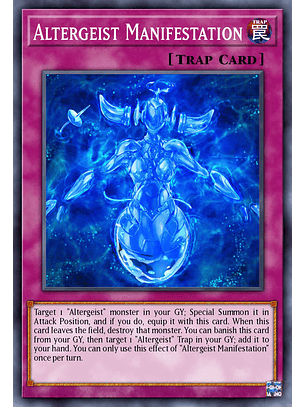 Selecciona 1 monstruo "Altergeist" en tu Cementerio; Invócalo de Modo Especial en Posición de Ataque y, si lo haces, equípalo con esta carta. Cuando esta carta deja el Campo, destruye ese monstruo. Puedes desterrar esta carta en tu Cementerio, y después seleccionar 1 Trampa "Altergeist" en tu Cementerio; añádela a tu mano. Sólo puedes usar este efecto de "Altergeist Manifestación" una vez por turno.