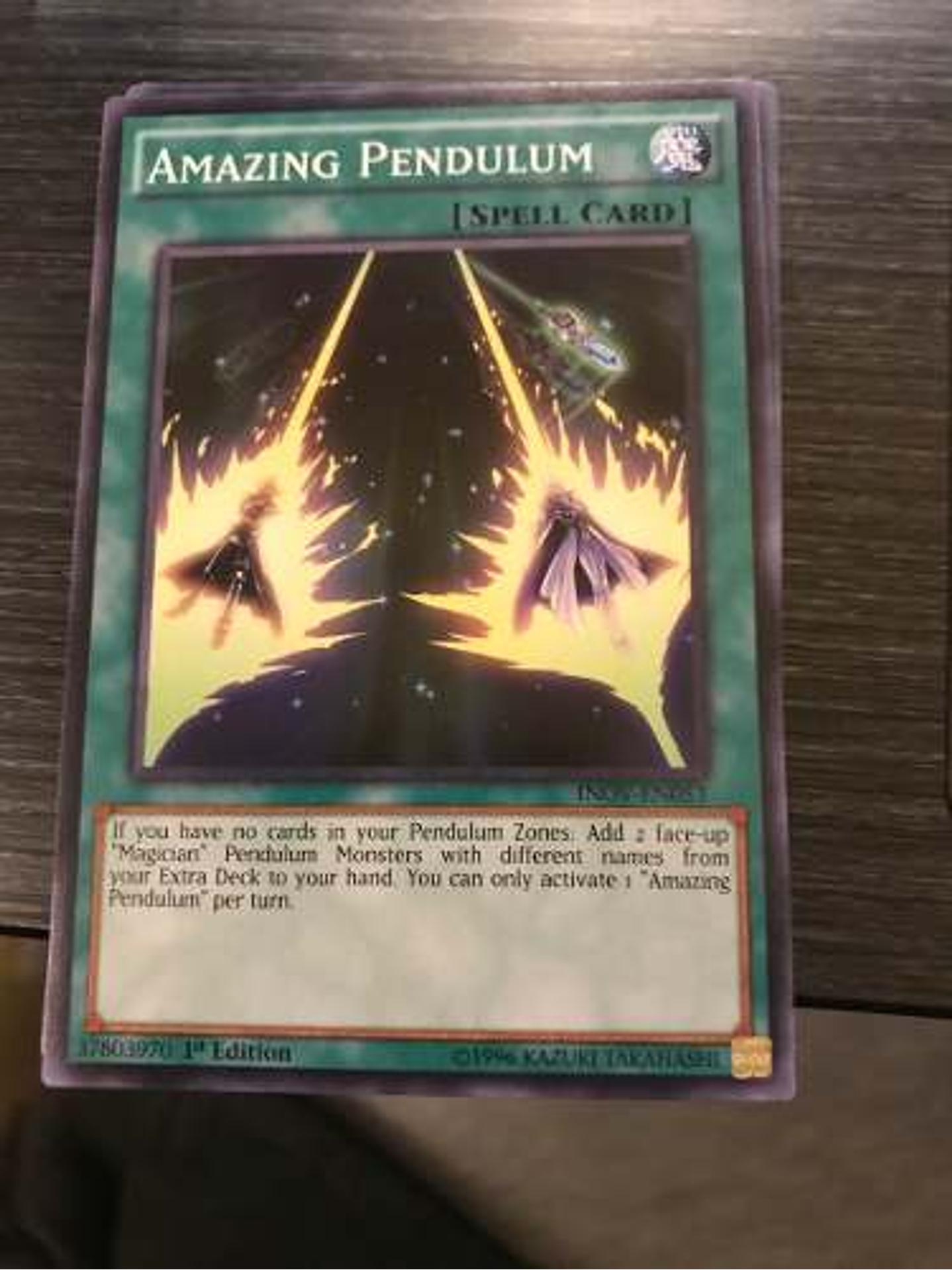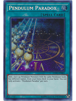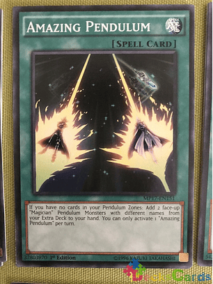 Si no tienes cartas en tus Zonas de Péndulo: Añade a tu mano, desde tu Deck Extra, 2 Monstruos de Péndulo "Mago" boca arriba con nombres diferentes. Sólo puedes activar 1 "Péndulo Increíble" por turno.