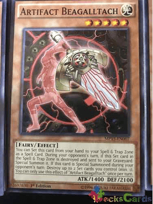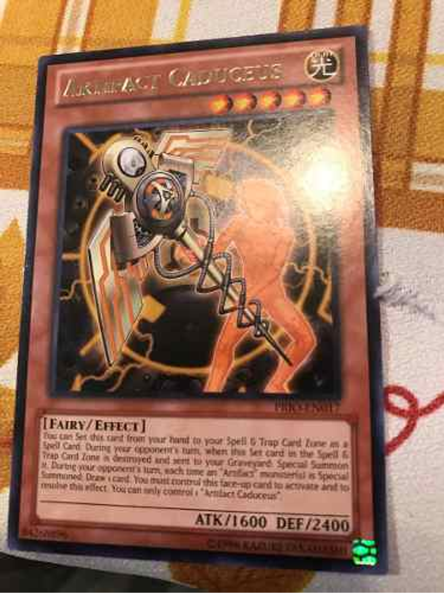 Puedes Colocar en tu Zona de Magia y Trampas esta carta en tu mano como una Carta Mágica. Durante el turno de tu adversario, si esta carta Colocada en la Zona de Magia y Trampas es destruida y mandada a tu Cementerio: Invócala de Modo Especial. Durante el turno de tu adversario, cada vez que uno o más monstruos "Artefacto" son Invocados de Modo Especial: roba 1 carta. Debes controlar esta carta boca arriba para activar y resolver este efecto. Sólo puedes controlar 1 "Artefacto Caduceo".