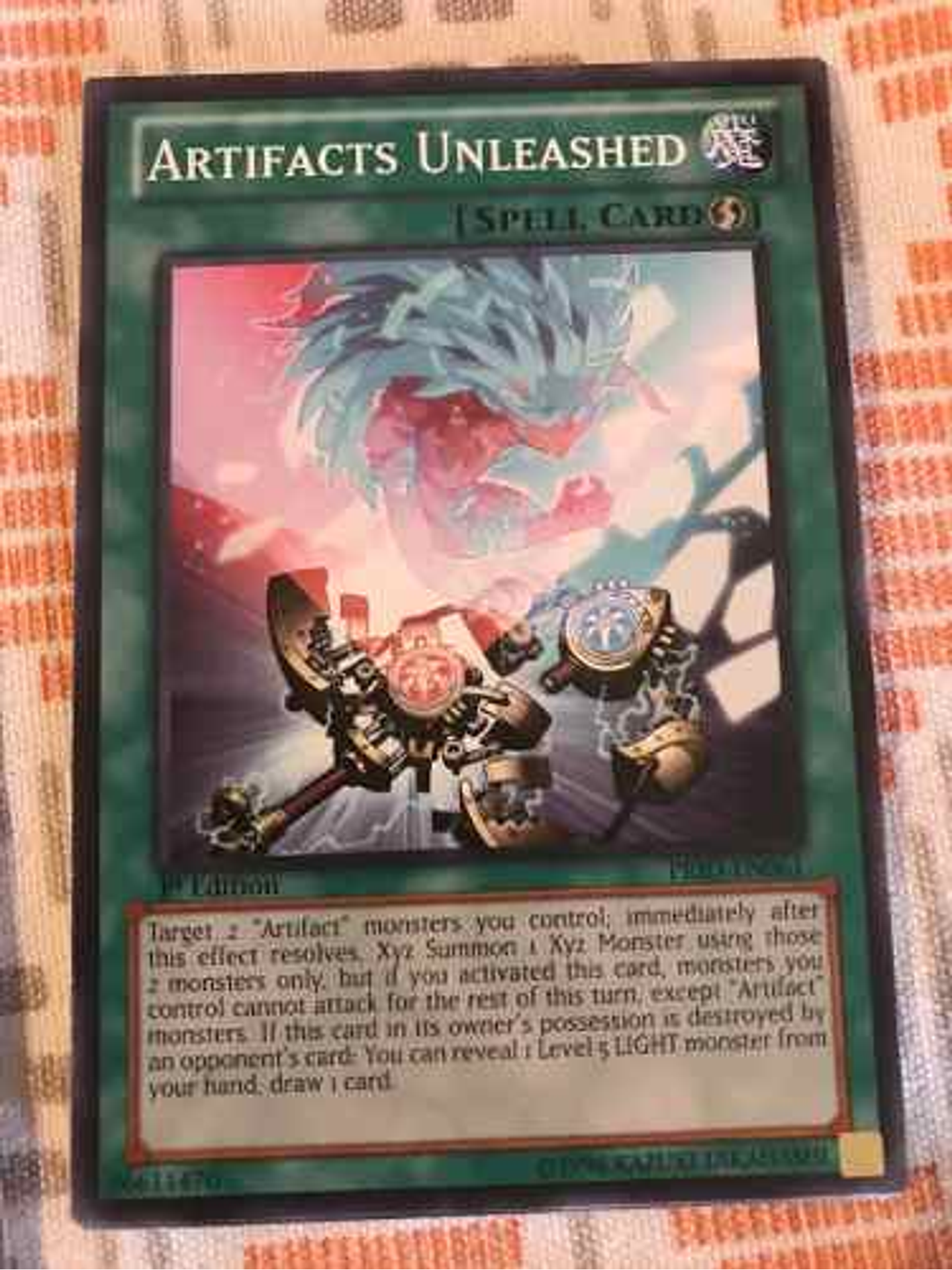 Selecciona 2 monstruos "Artefacto" que controles; inmediatamente después de que se resuelve este efecto, Invoca Xyz 1 Monstruo Xyz usando solamente a esos 2 monstruos, y además el resto de este turno después de que se resuelve esta carta los monstruos que controles no pueden atacar, excepto los monstruos "Artefacto". Si esta carta en posesión de su dueño es destruida por una carta de tu adversario: puedes mostrar 1 monstruo de LUZ de Nivel 5 en tu mano; roba 1 carta.