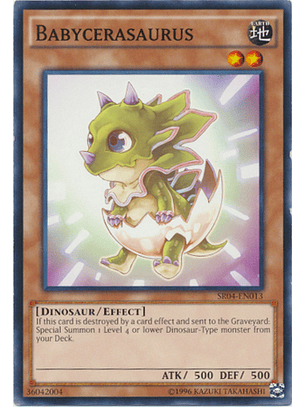 Si esta carta es destruida por efecto de una carta y mandada al Cementerio: Invoca de Modo Especial, desde tu Deck, 1 monstruo de Tipo Dinosaurio de Nivel 4 o menor.