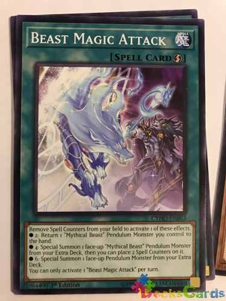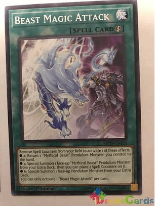 Retira Contadores Mágicos de tu Campo para activar 1 de estos efectos.● 2: Devuelve a la mano 1 Monstruo de Péndulo "Bestia Mítica" que controles.● 4: Invoca de Modo Especial 1 Monstruo de Péndulo "Bestia Mítica" boca arriba en tu Deck Extra, y después puedes poner 2 Contadores Mágicos en ella.● 6: Invoca de Modo Especial 1 Monstruo de Péndulo boca arriba en tu Deck Extra.Sólo puedes activar 1 "Ataque Mágico de la Bestia" por turno.