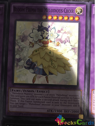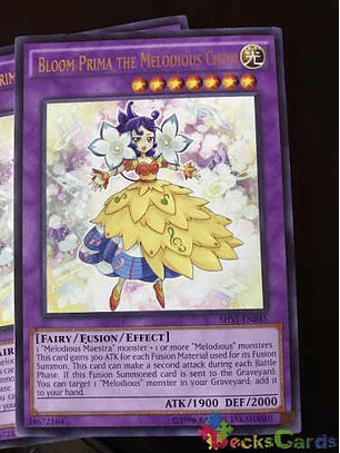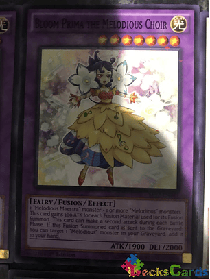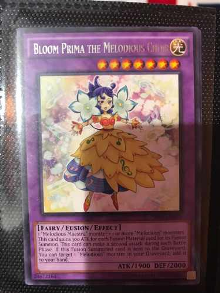 1 monstruo "Maestra Melodiosa" + 1 o más monstruos "Melodiosa"Esta carta gana 300 ATK por cada Material de Fusión usado en su Invocación por Fusión. Esta carta puede hacer un segundo ataque durante cada Battle Phase. Si esta carta Invocada por Fusión es mandada al Cementerio: puedes seleccionar 1 monstruo "Melodiosa" en tu Cementerio; añádelo a tu mano.