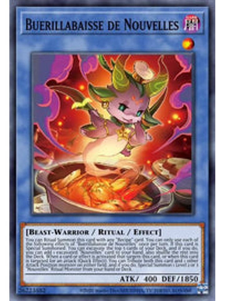 Puedes Invocar esta carta por Ritual con una carta "Receta". Si esta carta es Invocada de Modo Especial: puedes excavar las 5 cartas de la parte superior de tu Deck y, si lo haces, puedes añadir a tu mano 1 carta "Nouvelles" excavada, y además barajar el resto al Deck. Cuando es activada una carta o efecto que selecciona esta carta en el Campo, o cuando esta carta es seleccionada para un ataque (Efecto Rápido): puedes Sacrificar esta carta y 1 monstruo en Posición de Ataque en cualquier Campo y, si lo haces, Invoca de Modo Especial, desde tu mano o Deck, 1 Monstruo de Ritual "Nouvelles" de Nivel 2 o 3. Sólo puedes usar cada efecto de "Buerllabesa de Nouvelles" una vez por turno.