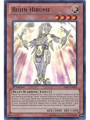 No puede ser Invocado de Modo Normal/Colocado. Debe ser primero Invocado de Modo Especial (desde tu mano) desterrando 1 monstruo "Bujin" en tu Cementerio, excepto "Bujin Hirume". Si esta carta, Invocada de esta forma, es destruida por una carta de tu adversario (en batalla o por efecto de una carta), y mandada a tu Cementerio desde tu lado del Campo, y ambos jugadores tienen cartas en la mano: puedes descartar 1 carta, y después tu adversario descarta 1 carta. Sólo puedes controlar 1 "Bujin Hirume".