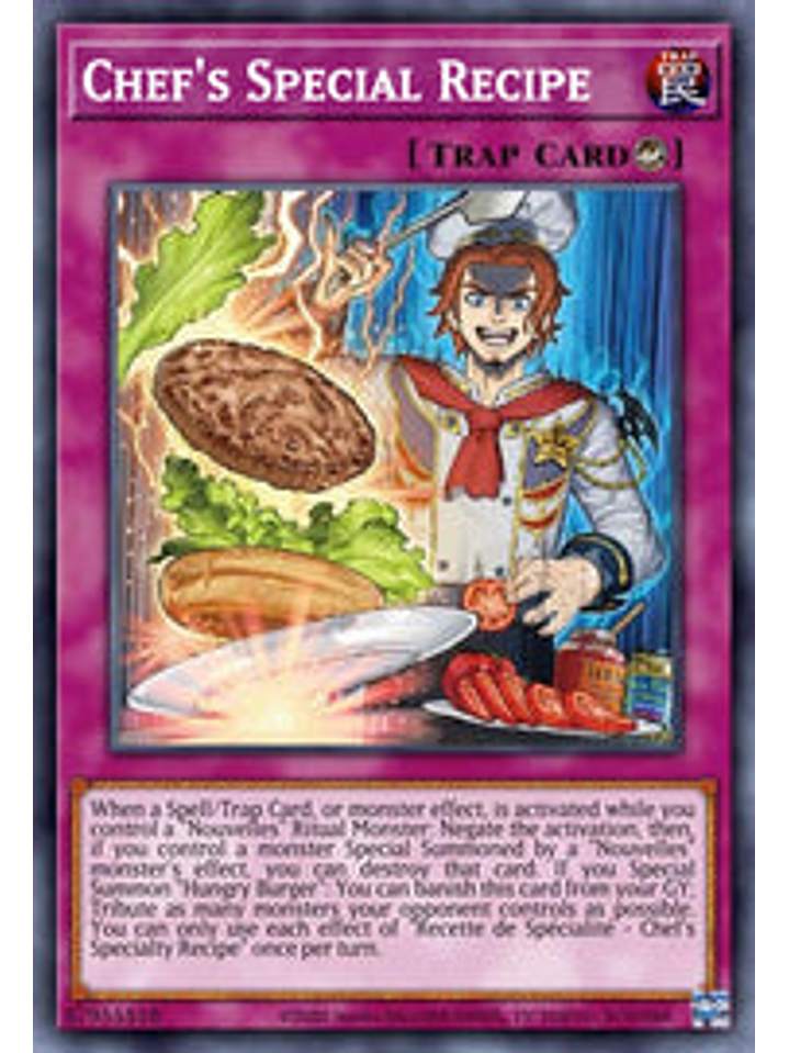 Cuando es activada una Carta Mágica/de Trampa o efecto de monstruo, mientras controlas un Monstruo de Ritual "Nouvelles": niega la activación, y después puedes destruir esa carta si controlas un monstruo que fue Invocado de Modo Especial por efecto de un monstruo "Nouvelles". Si Invocas "Hamburguesa Hambrienta" de Modo Especial: puedes desterrar esta carta en tu Cementerio; Sacrifica tantos monstruos que controle tu adversario como sea posible. Sólo puedes usar cada efecto de "La Receta Especial del Chef" una vez por turno.