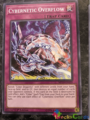 Destierra uno o más "Ciber Dragón" con diferentes Niveles en tu mano, Campo boca arriba y/o Cementerio, y después destruye la misma cantidad de cartas que controle tu adversario. Si esta carta en el Campo es destruida por el efecto de una carta: añade a tu mano 1 Mágica/Trampa "Ciber" o "Cíber" en tu Deck. Sólo puedes usar cada efecto de "Desborde Cibernético" una vez por turno.