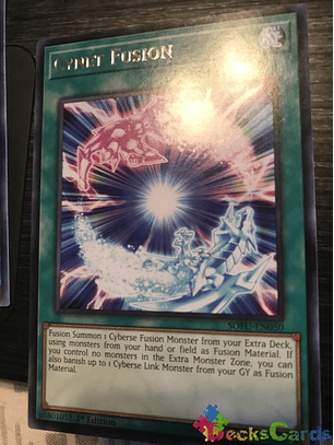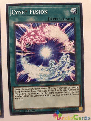 Invoca por Fusión 1 Monstruo de Fusión Ciberso desde tu Deck Extra, usando monstruos en tu mano o Campo como Material de Fusión. Si no controlas monstruos en la Zona de Monstruos Extra, también puedes desterrar hasta 1 Monstruo de Enlace Ciberso en tu Cementerio como Material de Fusión.