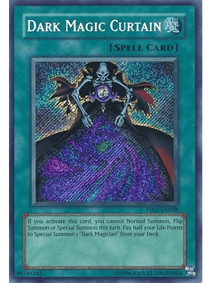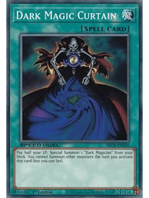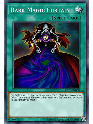 Paga la mitad de tus LP; Invoca de Modo Especial, desde tu Deck, 1 "Mago Oscuro". No puedes Invocar otros monstruos en el turno en el que activas esta carta (pero sí puedes Colocar).