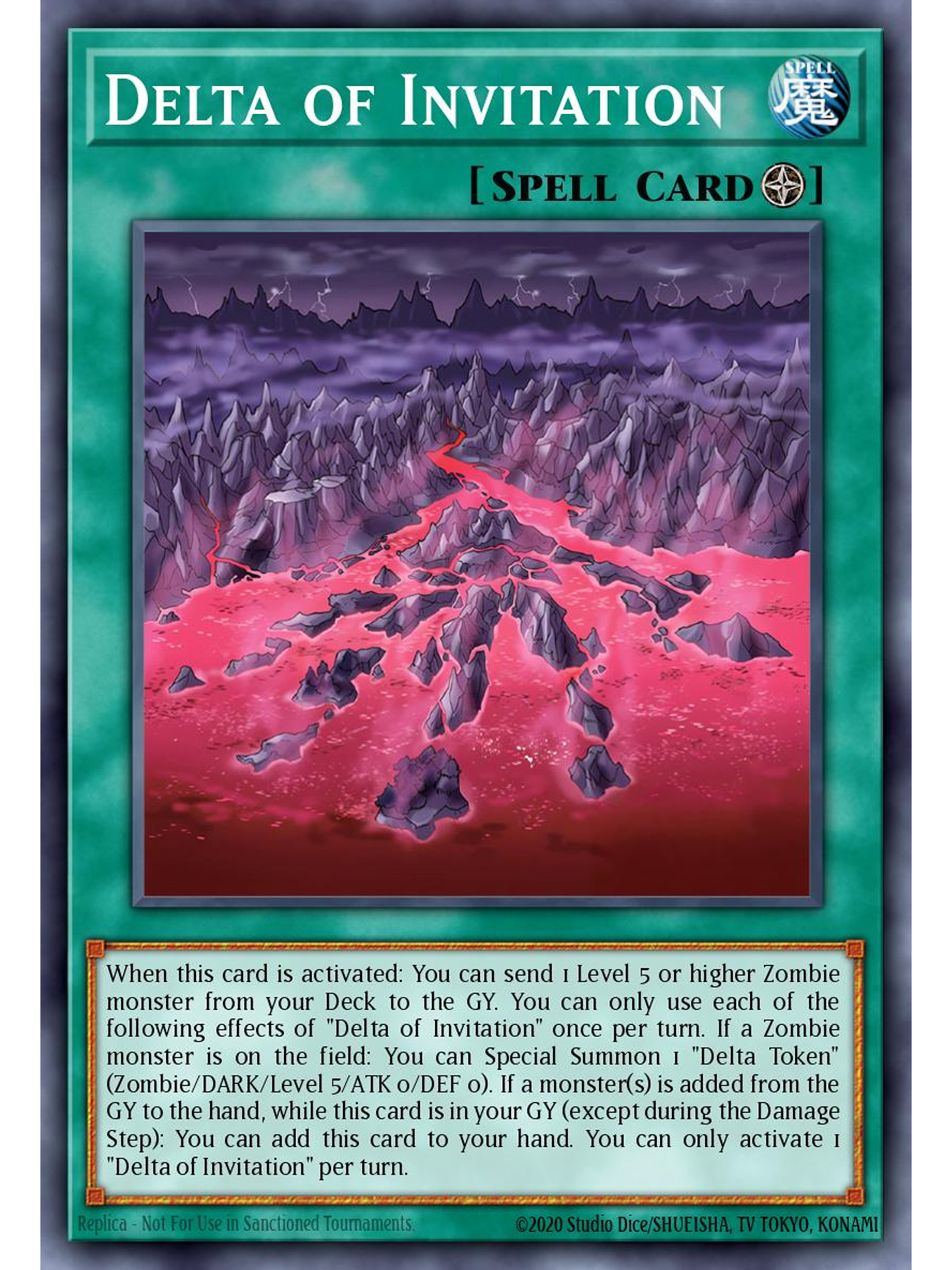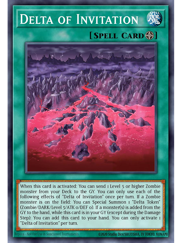 Cuando esta carta es activada: puedes mandar al Cementerio 1 monstruo Zombi de Nivel 5 o mayor en tu Deck. Sólo puedes usar cada uno de los siguientes efectos de "Delta de Invitación" una vez por turno. Si un monstruo Zombi está en el Campo: puedes Invocar de Modo Especial 1 "Ficha Delta" (Zombi/OSCURIDAD/Nivel 5/ATK 0/DEF 0). Si uno o más monstruos en el Cementerio son añadidos a la mano, mientras esta carta está en tu Cementerio (excepto durante el Damage Step): puedes añadir esta carta a tu mano. Sólo puedes activar 1 "Delta de Invitación" por turno.