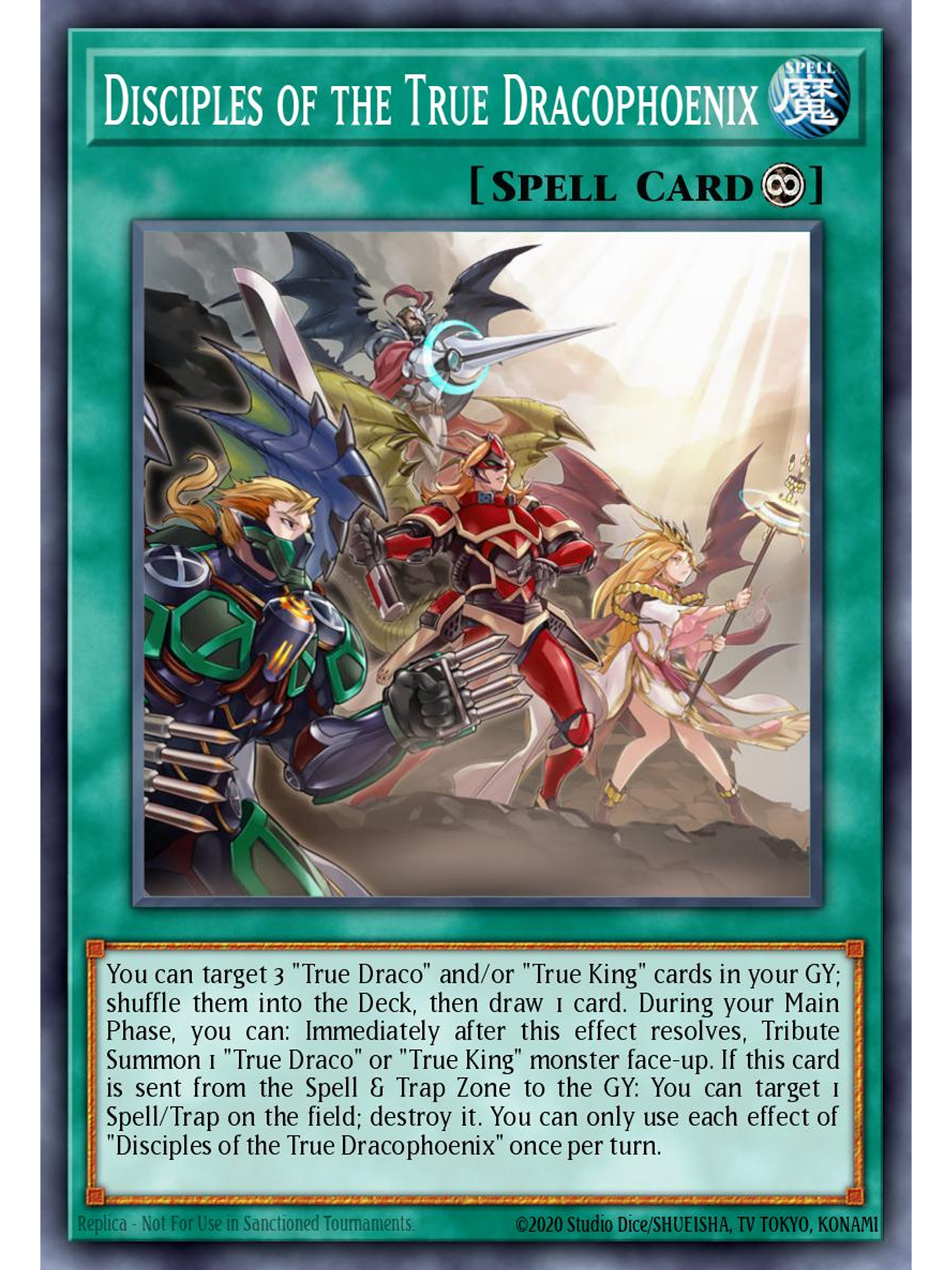 Puedes seleccionar 3 cartas "Verdadero/a Draco" y/o "Rey Verdadero" en tu Cementerio; barájalas al Deck, y después roba 1 carta. Durante tu Main Phase, puedes: inmediatamente después de que se resuelva este efecto, Invocar por Sacrificio 1 monstruo boca arriba "Verdadero/a Draco" o "Rey Verdadero". Si esta carta es mandada de la Zona de Magia y Trampas al Cementerio: puedes seleccionar 1 Mágica/Trampa en el Campo; destrúyela. Sólo puedes usar cada efecto de "Discípulos de la Verdadera Dracofénix" una vez por turno.