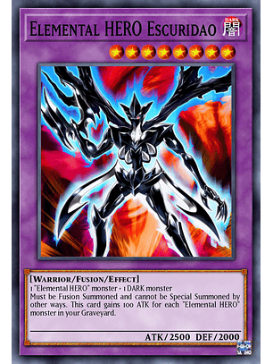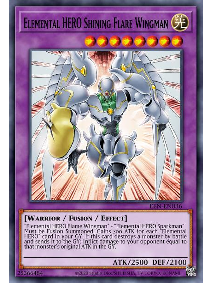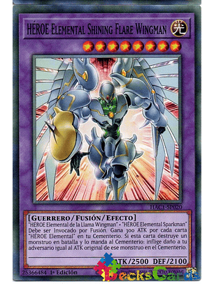 "HÉROE Elemental de la Llama Wingman" + "HÉROE Elemental Sparkman"Debe ser Invocado por Fusión. Gana 300 ATK por cada carta "HÉROE Elemental" en tu Cementerio. Si esta carta destruye un monstruo en batalla y lo manda al Cementerio: inflige daño a tu adversario igual al ATK original en el Cementerio de ese monstruo.