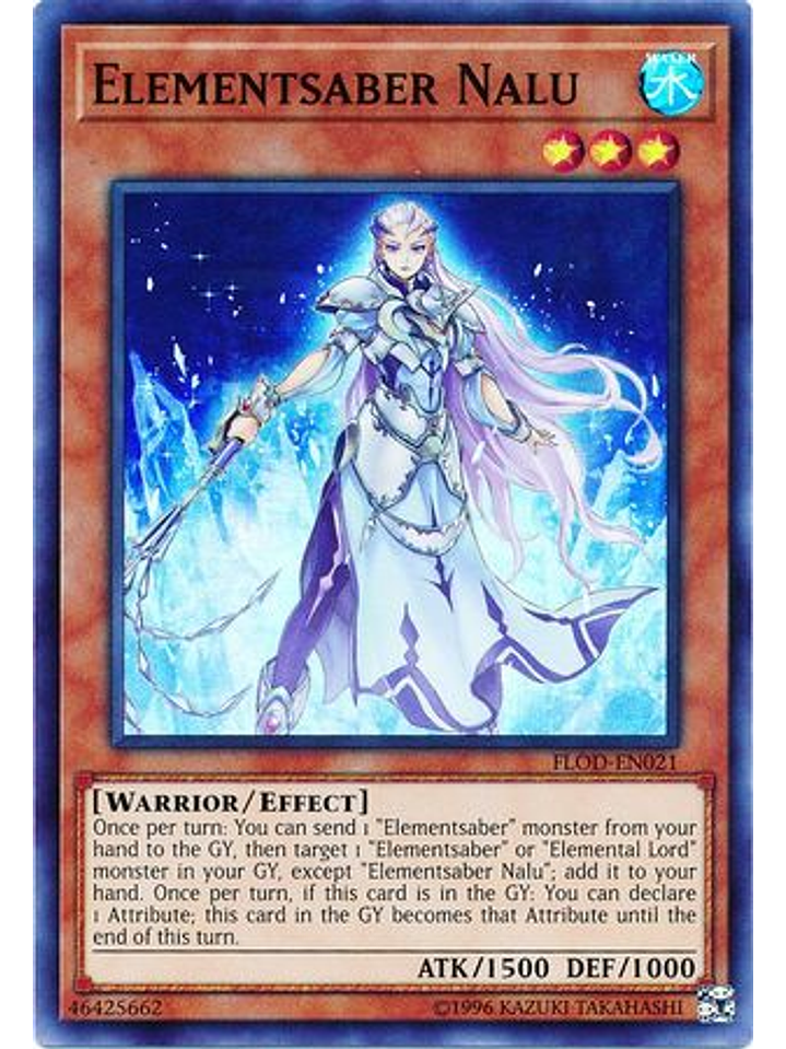 Una vez por turno: puedes mandar al Cementerio 1 monstruo "Sablelemento" en tu mano, y después seleccionar 1 monstruo "Sablelemento" o "Señor Elemental" en tu Cementerio, excepto "Sablelemento Nalu"; añádelo a tu mano. Una vez por turno, si esta carta está en el Cementerio: puedes declarar 1 Atributo; hasta el final de este turno, esta carta en el Cementerio se convierte en una carta con ese Atributo.