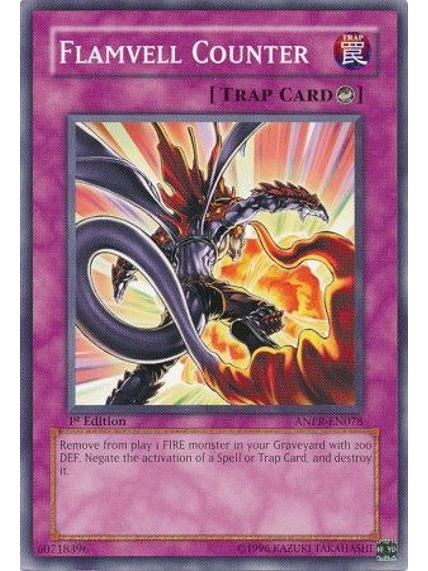 Cuando es activada una Carta Mágica/de Trampa: destierra 1 monstruo de FUEGO con 200 DEF en tu Cementerio; niega la activación y, si lo haces, destruye la carta.
