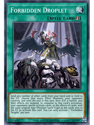 Manda al Cementerio cualquier cantidad de otras cartas en tu mano y/o Campo; elige esa cantidad de Monstruos de Efecto que controle tu adversario, y hasta el final de este turno, su ATK se divide a la mitad, y además sus efectos son negados. En respuesta a la activación de esta carta, tu adversario no puede activar cartas, o efectos de cartas, con el mismo tipo original (Monstruo/Mágica/Trampa) que las cartas mandadas al Cementerio para activar esta carta. Sólo puedes activar 1 "Gotas Prohibidas" por turno.