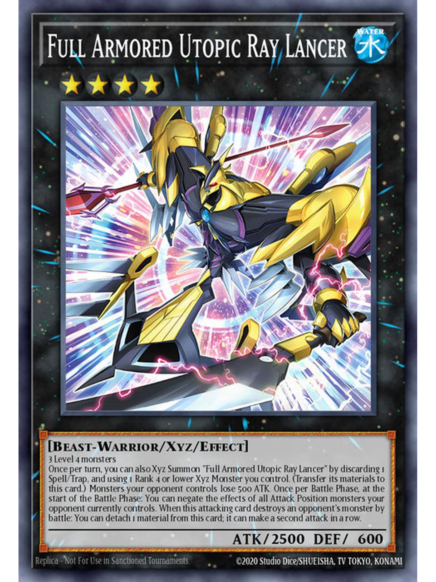 3 monstruos de Nivel 4Una vez por turno, también puedes Invocar Xyz "Lancero Rayo Utópico de Armadura Completa" descartando 1 Mágica/Trampa y usando 1 Monstruo Xyz de Rango 4 o menor que controles. (Transfiere sus materiales a esta carta). Los monstruos que controle tu adversario pierden 500 ATK. Al comienzo de la Battle Phase: puedes negar los efectos de todos los monstruos en Posición de Ataque que controle tu adversario en este momento. Cuando esta carta atacante destruye un monstruo del adversario en batalla: puedes desacoplar 1 material de esta carta; ésta puede hacer un segundo ataque inmediatamente después.