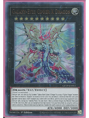 3 monstruos de Nivel 9También puedes Invocar Xyz esta carta usando un Monstruo Xyz "Ojos Galácticos" de Rango 8 que controles como material. (Transfiere sus materiales a esta carta). No puede ser usado como material para una Invocación Xyz. Una vez por turno: puedes desacoplar 1 material de esta carta, y después seleccionar 1 carta en el Campo; destrúyela. Si esta carta Invocada Xyz que controles es destruida en batalla con un monstruo atacante del adversario, o destruida por el efecto de una carta del adversario, y mandada a tu Cementerio: puedes seleccionar 1 "Dragón Cifrado de Ojos Galácticos" en tu Cementerio; Invócalo de Modo Especial.
