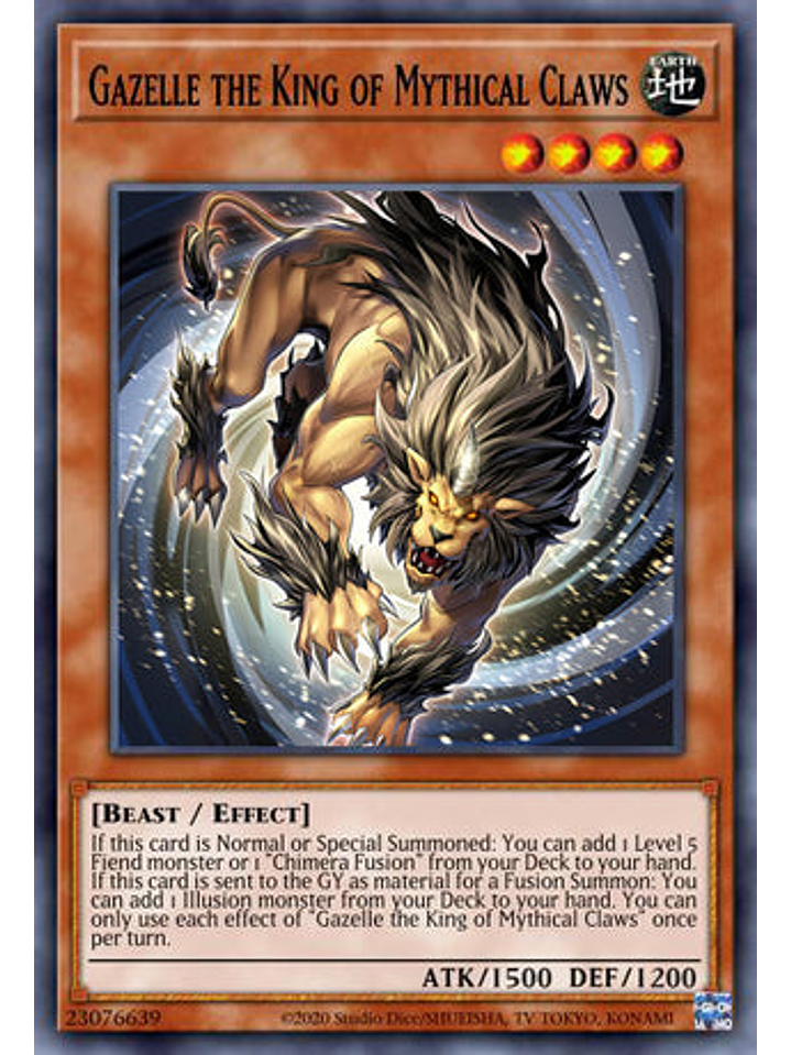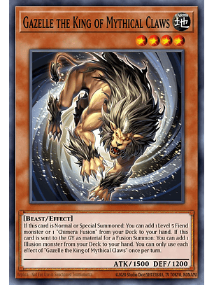 Si esta carta es Invocada de Modo Normal o Especial: puedes añadir a tu mano 1 monstruo Demonio de Nivel 5 o 1 "Fusión Quimera" en tu Deck. Si esta carta es mandada al Cementerio como material para una Invocación por Fusión: puedes añadir a tu mano 1 monstruo Ilusión en tu Deck. Sólo puedes usar cada efecto de "Gazelle el Rey de las Garras Míticas" una vez por turno.
