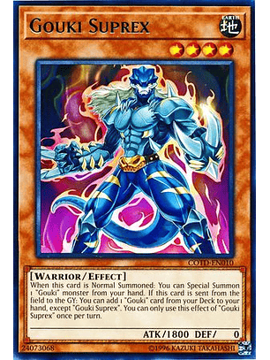 Si no controlas monstruos, o todos los monstruos que controlas son monstruos "Gouki", puedes Invocar esta carta de Modo Normal sin Sacrificar. Si esta carta es mandada del Campo al Cementerio: puedes añadir a tu mano 1 carta "Gouki" en tu Deck, excepto "Gouki Alzaescorpión". Sólo puedes usar este efecto de "Gouki Alzaescorpión" una vez por turno.