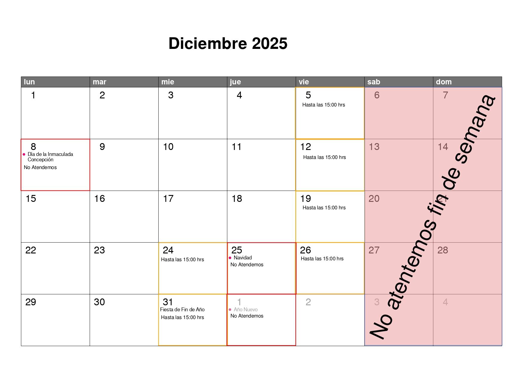 5-12-19-24-26-31 Tendremos horario especial hasta las 15:00 hrs