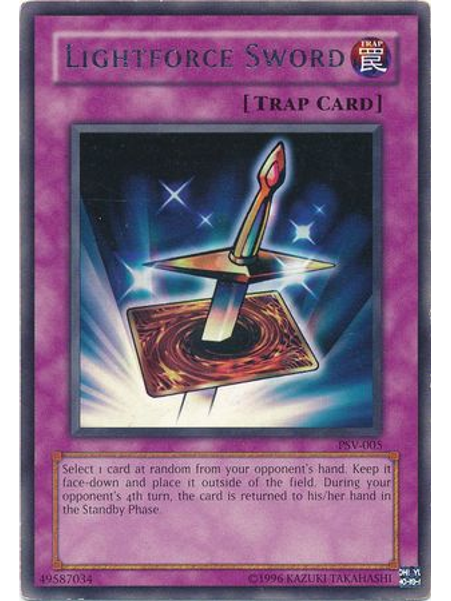 Destierra 1 carta al azar en la mano de tu adversario, boca abajo. Durante la 4º Standby Phase de tu adversario, después de la activación de esta carta, devuelve esa carta a su mano.