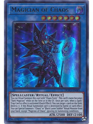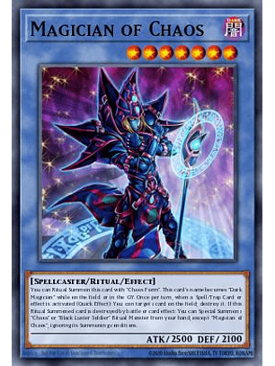 Puedes Invocar esta carta por Ritual con "Forma del Caos". El nombre de esta carta se convierte en "Mago Oscuro" mientras está en el Campo o en el Cementerio. Una vez por turno, cuando una Carta Mágica/de Trampa o efecto es activado (Efecto Rápido): puedes seleccionar 1 carta en el Campo; destrúyela. Si esta carta Invocada por Ritual es destruida en batalla o por el efecto de una carta: puedes Invocar de Modo Especial, desde tu mano, 1 Monstruo de Ritual "Caos" o "Soldado del Brillo Negro", excepto "Mago del Caos", ignorando sus condiciones de Invocación.