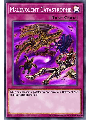 Cuando un monstruo de tu adversario declara un ataque: destruye todas las Cartas Mágicas y de Trampa en el Campo.