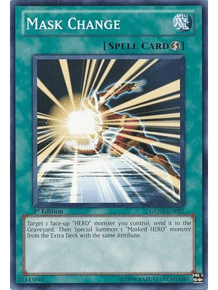 Descarta 1 carta, y después selecciona 1 monstruo boca arriba que controles y que tenga Nivel; mándalo al Cementerio y además, después de eso, si dejó el Campo por este efecto, Invoca de Modo Especial, desde tu Deck Extra, 1 monstruo "HÉROE Enmascarado" con el mismo Atributo pero con Nivel mayor que el Atributo/Nivel que tenía el monstruo cuando estaba en el Campo (si estaba boca abajo, su Atributo/Nivel original. Esta Invocación Especial se trata como una Invocación Especial con "Cambio de Máscara"). Sólo puedes activar 1 "Cambio de Máscara II" por turno.