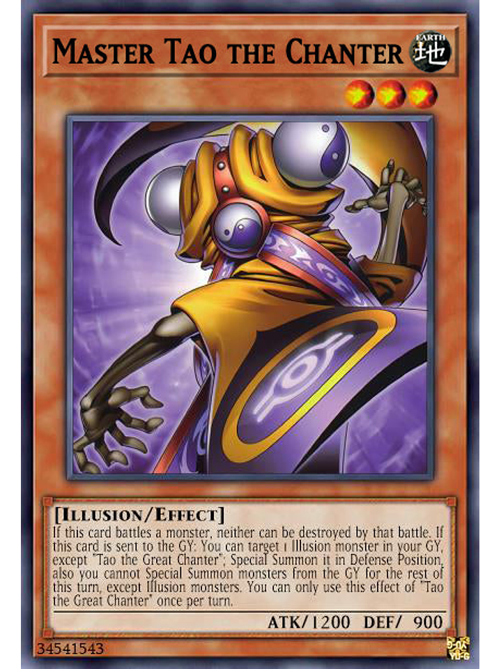 Si esta carta batalla con un monstruo, ninguno puede ser destruido en esa batalla. Si esta carta es mandada al Cementerio: puedes seleccionar 1 monstruo Ilusión en tu Cementerio, excepto "Maestro Tao el Chanter"; Invócalo de Modo Especial en Posición de Defensa, y además no puedes Invocar de Modo Especial desde el Cementerio por el resto de este turno, excepto monstruos Ilusión. Sólo puedes usar este efecto de "Maestro Tao el Chanter" una vez por turno.