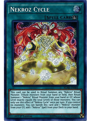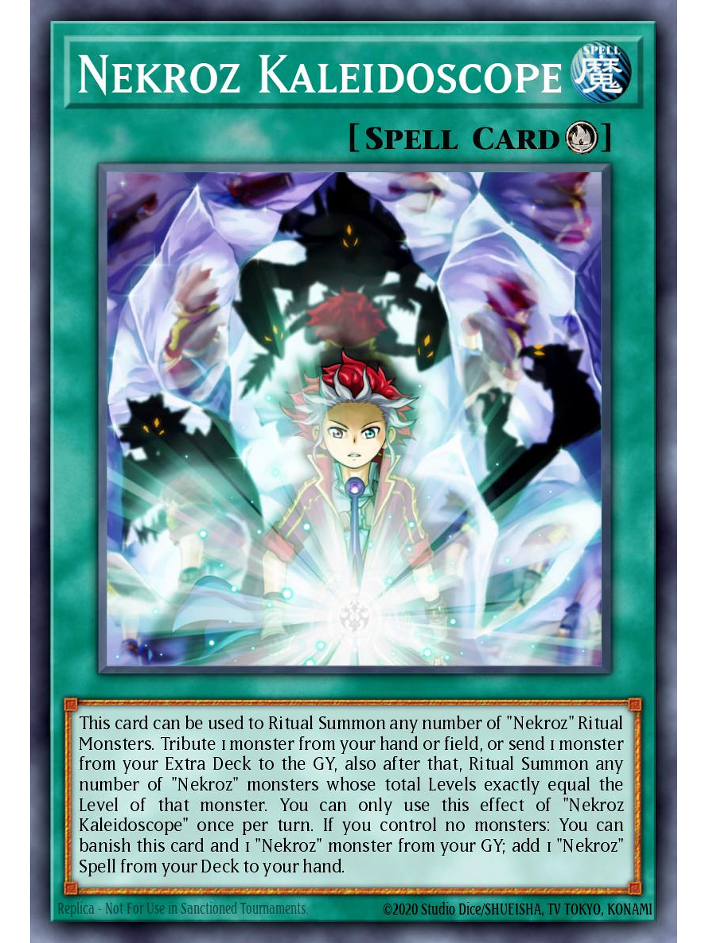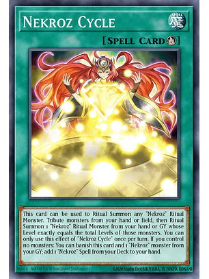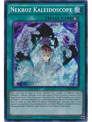 Esta carta puede ser usada para Invocar por Ritual a cualquier cantidad de Monstruos de Ritual "Necroz". Sacrifica 1 monstruo en tu mano o Campo, o manda al Cementerio 1 monstruo en tu Deck Extra, y además después de eso Invoca por Ritual cualquier cantidad de monstruos "Necroz" cuya suma de Niveles sea exactamente igual al Nivel de ese monstruo. Sólo puedes usar este efecto de "Caleidoscopio Necroz" una vez por turno. Si no controlas monstruos: puedes desterrar esta carta y 1 monstruo "Necroz" en tu Cementerio; añade a tu mano 1 Mágica "Necroz" en tu Deck.