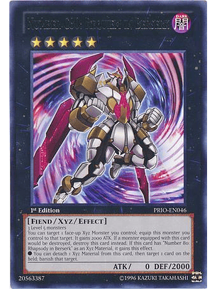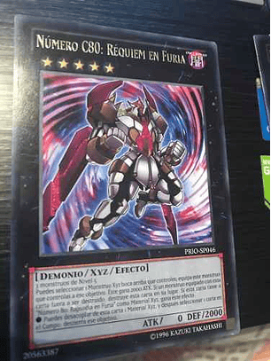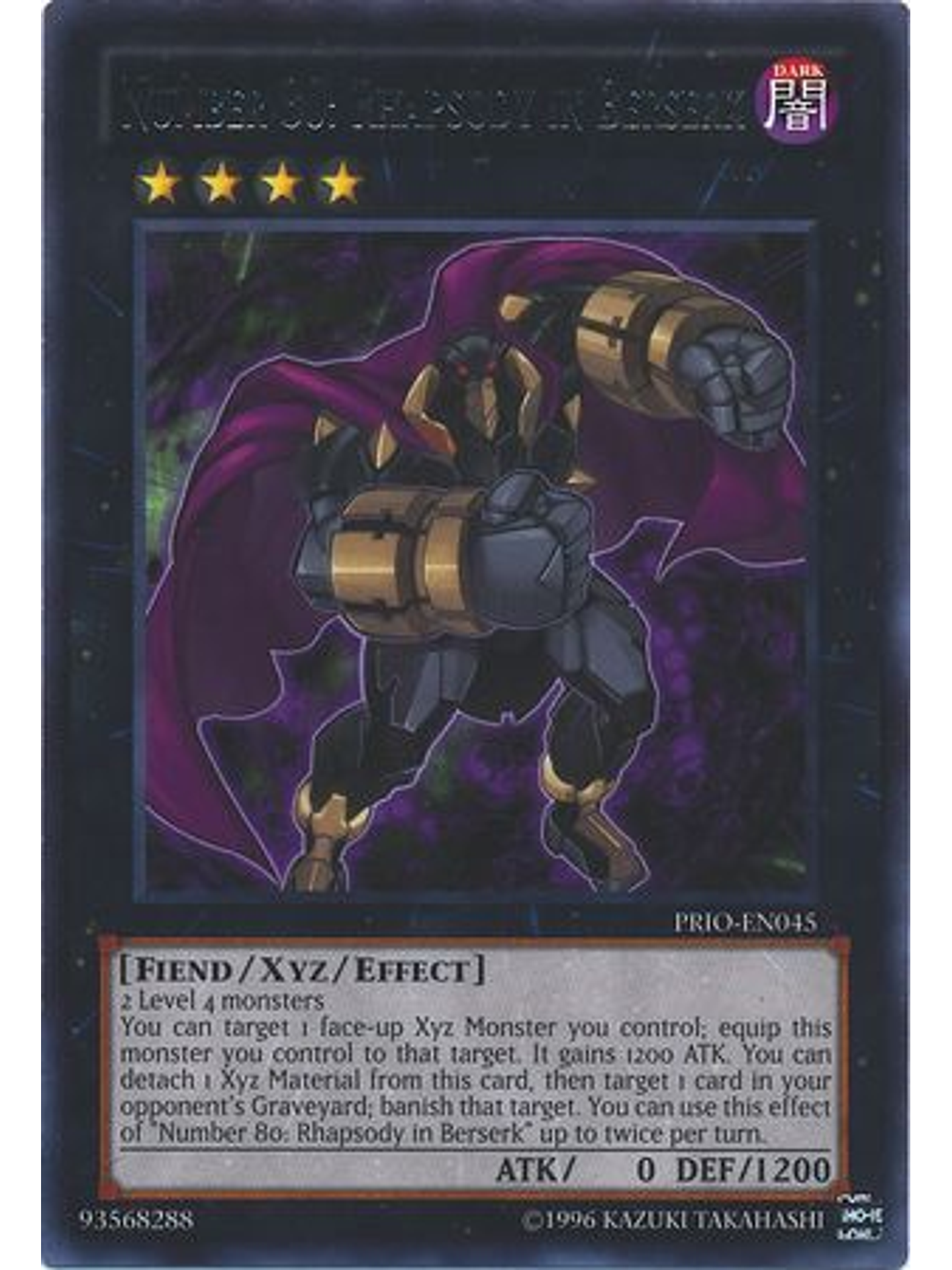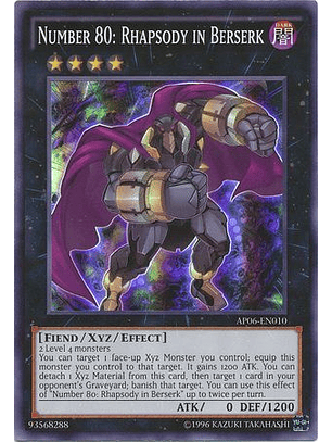 2 monstruos de Nivel 4Puedes seleccionar 1 Monstruo Xyz boca arriba que controles; equipa este monstruo que controlas a ese objetivo. Éste gana 1200 ATK. Puedes desacoplar de esta carta 1 Material Xyz, y después seleccionar 1 carta en el Cementerio de tu adversario; destierra ese objetivo. Puedes usar este efecto de "Número 80: Rapsodia en Furia" hasta dos veces por turno.