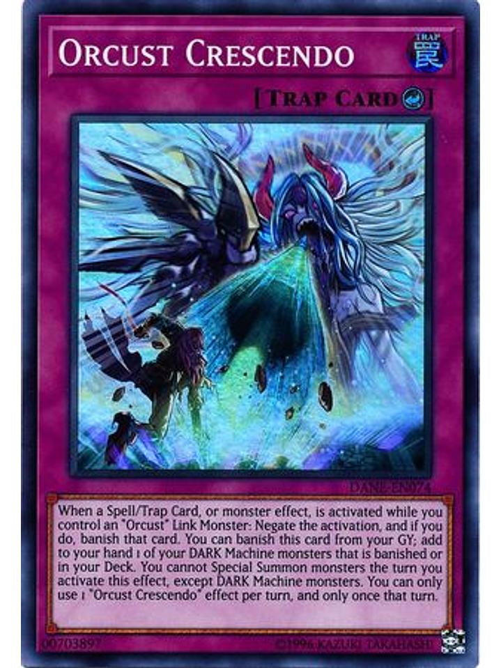Cuando es activada una Carta Mágica/de Trampa o efecto de monstruo, mientras controlas un Monstruo de Enlace "Orcust": niega la activación y, si lo haces, destierra esa carta. Puedes desterrar esta carta en tu Cementerio; añade a tu mano 1 de tus monstruos Máquina de OSCURIDAD que esté desterrada o en tu Deck. El turno en el que activaste este efecto, no puedes Invocar monstruos de Modo Especial, excepto monstruos Máquina de OSCURIDAD. Sólo puedes usar 1 efecto de "Crescendo Orcust" por turno, y sólo una vez ese turno.