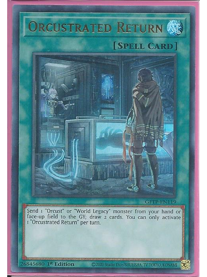 Manda al Cementerio 1 monstruo "Orcust" o "Legado Mundial" en tu mano o Campo boca arriba; roba 2 cartas. Sólo puedes activar 1 "Regreso Orcustrado" por turno.