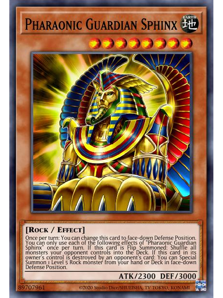 Una vez por turno: puedes cambiar esta carta a Posición de Defensa boca abajo. Sólo puedes usar cada uno de los siguientes efectos de "Esfinge Guardián Faraónica" una vez por turno. Si esta carta es Invocada por Volteo: baraja al Deck todos los monstruos que controle tu adversario. Si esta carta controlada por su dueño es destruida por una carta del adversario: puedes Invocar de Modo Especial, desde tu mano o Deck, 1 monstruo Roca de Nivel 5 en Posición de Defensa boca abajo.