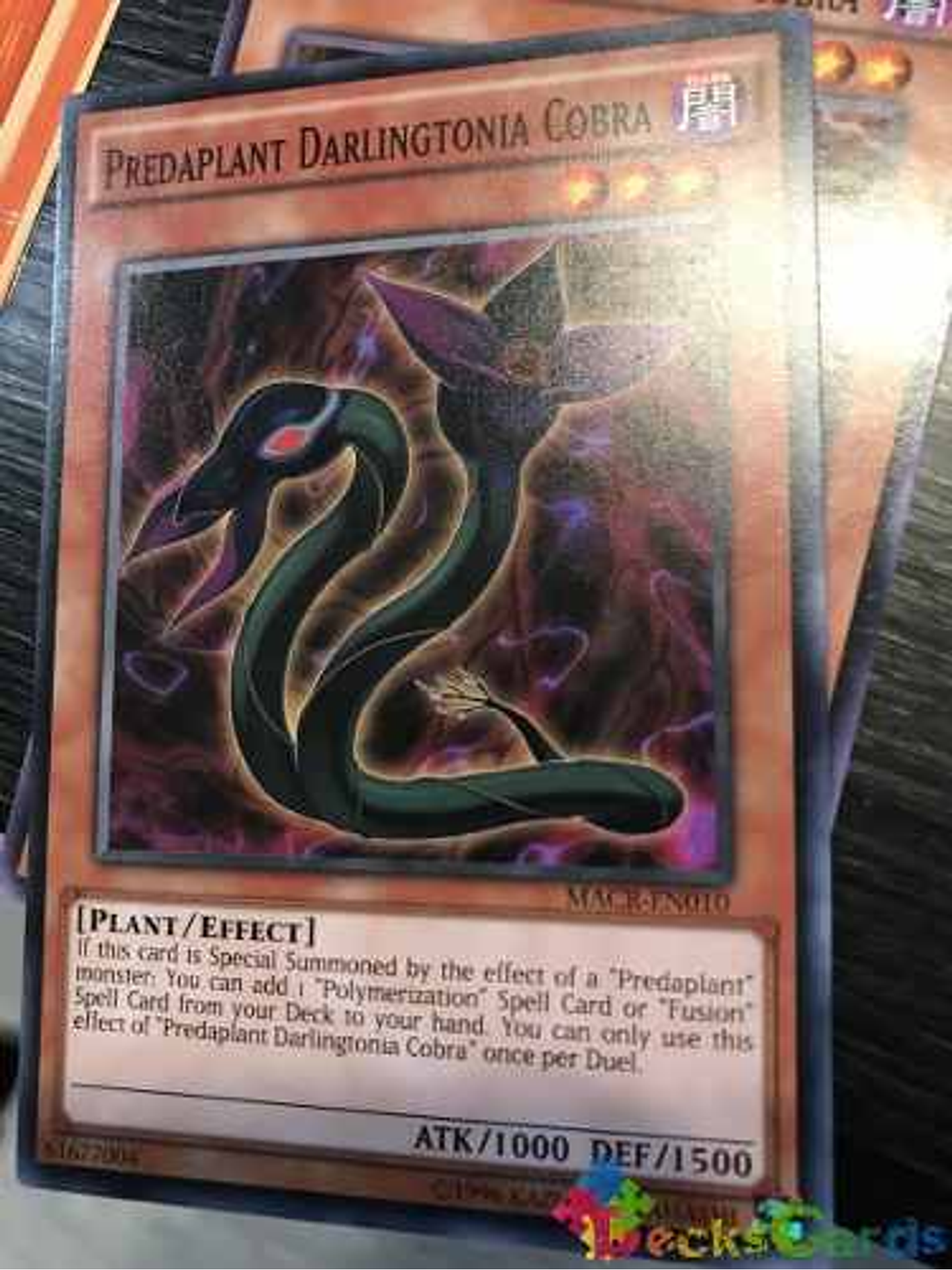 Si esta carta es Invocada de Modo Especial por el efecto de un monstruo "Predaplanta": puedes añadir a tu mano 1 Carta Mágica "Polimerización" o 1 Carta Mágica "Fusión" en tu Deck. Sólo puedes usar este efecto de "Predaplanta Darlingtonia Cobra" una vez por Duelo.