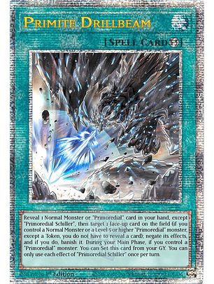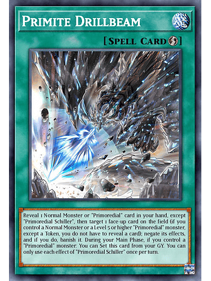 Muestra 1 carta "Primitio" o 1 Monstruo Normal en tu mano, excepto "Rayo de Perforación de Primitio" (o, si controlas un Monstruo Normal o un monstruo "Primitio" de Nivel 5 o mayor, excepto una Ficha, puedes activar este efecto sin mostrar una carta), y después selecciona 1 carta boca arriba en el Campo; niega sus efectos y, si lo haces, destiérrala. Durante tu Main Phase, si controlas un monstruo "Primitio": puedes Colocar esta carta desde tu Cementerio. Sólo puedes usar cada efecto de "Rayo de Perforación de Primitio" una vez por turno.