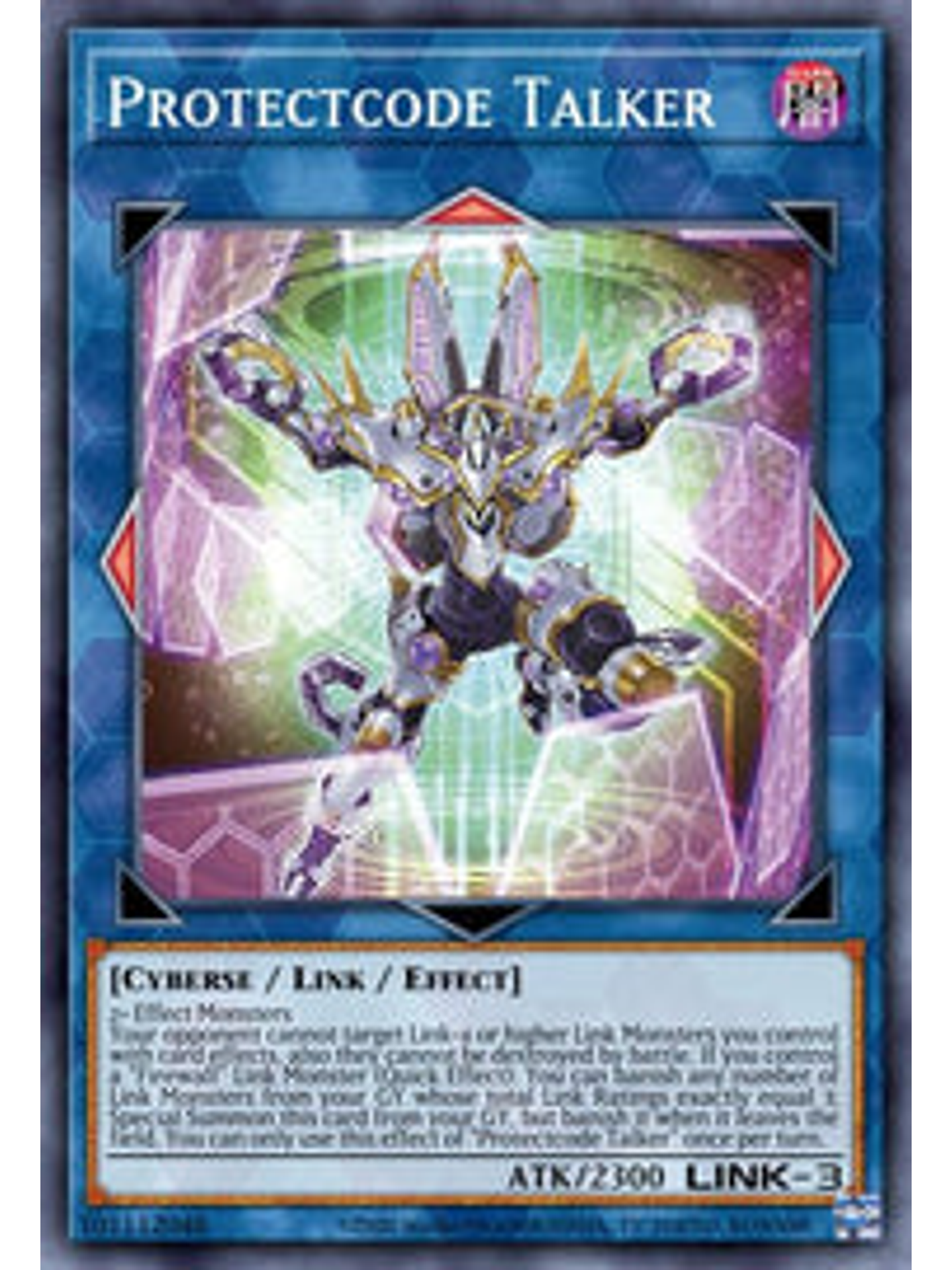 2+ Monstruos de EfectoTu adversario no puede seleccionar monstruos de Link-4 o mayor que controles con efectos de cartas, y además no pueden ser destruidos en batalla. Si controlas un Monstruo de Enlace "Cortafuego" (Efecto Rápido): puedes desterrar Monstruos de Enlace en tu Cementerio cuyos Rating de Enlace combinados sean exactamente igual a 3; Invoca esta carta de Modo Especial desde tu Cementerio, pero destiérrala cuando deje el Campo. Sólo puedes usar este efecto de "Proteccodificador Hablador" una vez por turno.