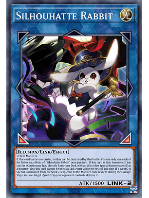 2 Monstruos de EfectoSi esta carta batalla con un monstruo, ninguno puede ser destruido en esa batalla. Sólo puedes usar cada uno de los siguientes efectos de "Siluetsombrero Conejo" una vez por turno. Si esta carta es Invocada por Enlace: puedes Colocar 1 Trampa Continua desde tu Deck con un efecto que la Invoca a sí misma de Modo Especial como un monstruo, y además esta carta no puede ser usada como Material de Enlace este turno. Si una carta en la Zona de Magia y Trampas es Invocada de Modo Especial a la Zona de Monstruos (excepto durante el Damage Step): puedes seleccionar 1 Mágica/Trampa que controle tu adversario; destrúyela.