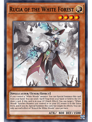 Si esta carta es Invocada de Modo Normal o Especial: puedes añadir a tu mano 1 Mágica/Trampa "Bosque Blanco" en tu Deck. Si esta carta está en tu Cementerio (Efecto Rápido): puedes seleccionar 1 Monstruo de Sincronía "Bosque Blanco" que controles o en tu Cementerio; devuélvelo al Deck Extra y, si lo haces, Invoca esta carta de Modo Especial, pero niega sus efectos. Sólo puedes usar cada efecto de "Silvy del Bosque Blanco" una vez por turno.
