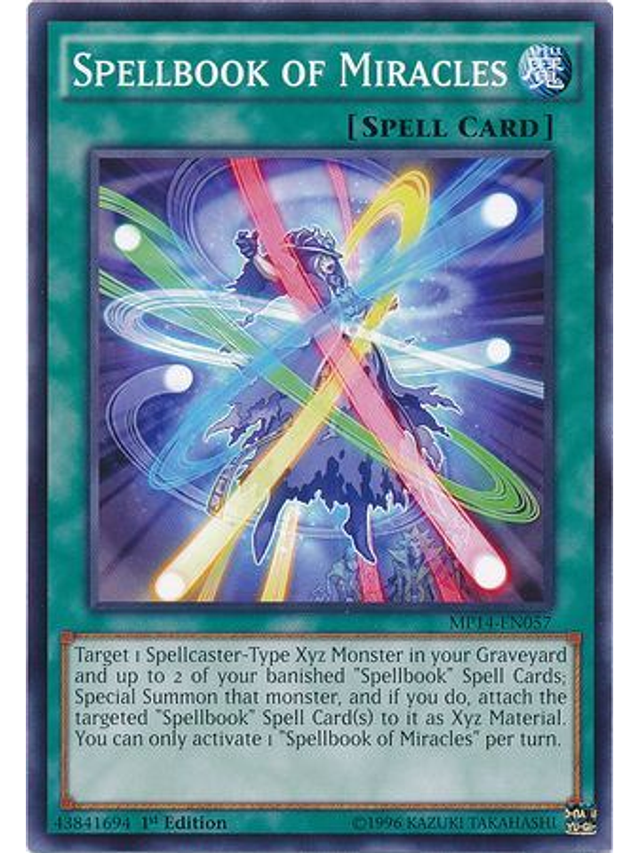 Selecciona 1 Monstruo Xyz de Tipo Lanzador de Conjuros en tu Cementerio y hasta 2 de tus Cartas Mágicas "Libro de Magia" desterradas; Invoca ese monstruo de Modo Especial y, si lo haces, acóplale la o las Cartas Mágicas "Libro de Magia" seleccionadas como Materiales Xyz. Sólo puedes activar 1 "Libro de Magia de los Milagros" por turno.