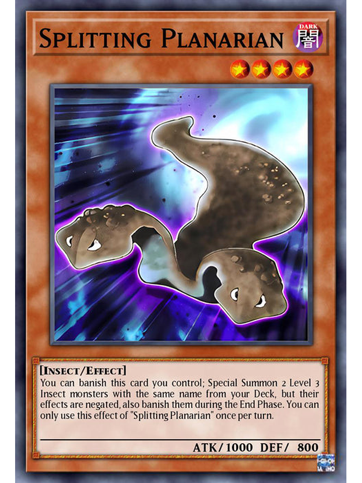 Puedes desterrar esta carta que controlas; Invoca de Modo Especial, desde tu Deck, 2 monstruos Insecto de Nivel 3 con el mismo nombre entre ellos, pero sus efectos son negados, y además destiérralos durante la End Phase. Sólo puedes usar este efecto de "Planaria en División" una vez por turno.