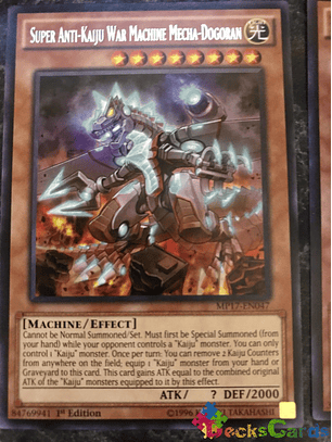 No puede ser Invocada de Modo Normal/Colocada. Debe ser primero Invocada de Modo Especial (desde tu mano) mientras tu adversario controle un monstruo "Kaiju". Sólo puedes controlar 1 monstruo "Kaiju". Una vez por turno: puedes retirar 2 Contadores Kaiju en cualquier lugar del Campo; equipa a esta carta 1 monstruo "Kaiju" en tu mano o Cementerio. Esta carta gana ATK igual al ATK original combinado de los monstruos "Kaiju" equipados a ella por este efecto.