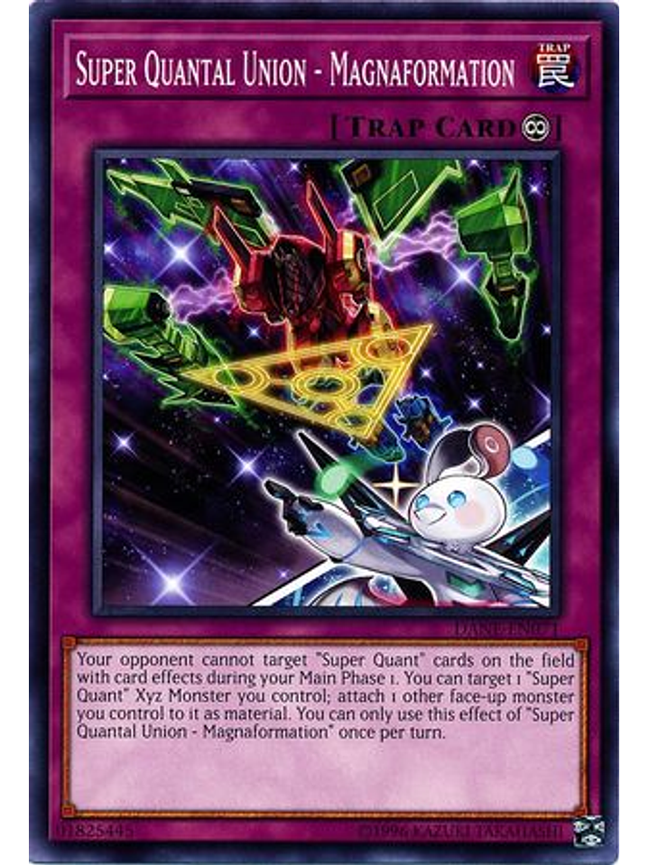 Tu adversario no puede seleccionar con efectos de cartas a cartas "Súper Cuant" en el Campo durante tu Main Phase 1. Puedes seleccionar 1 Monstruo Xyz "Súper Cuant" que controles; acóplale como material otro monstruo boca arriba que controles. Sólo puedes usar este efecto de "Magnaformación, Unión Súper Cuantal" una vez por turno.