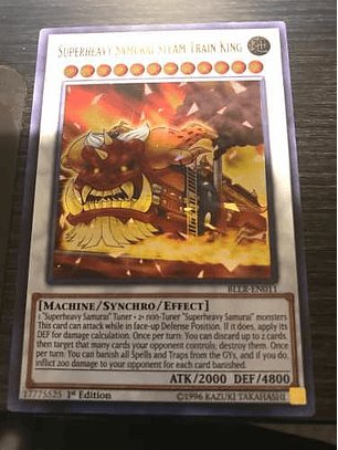 1 Cantante de Tipo Máquina + 1 o más monstruos "Samurai Superpesado" que no sean CantantesEsta carta puede atacar mientras esté en Posición de Defensa boca arriba. Si lo hace, aplica su DEF para el cálculo de daño. Una vez por turno, durante el turno de cualquier jugador, si no tienes Cartas Mágicas/de Trampa en tu Cementerio: puedes seleccionar 1 Carta Mágica/de Trampa en el Cementerio de tu adversario; Colócala en tu lado del Campo, pero destiérrala cuando deje el Campo.