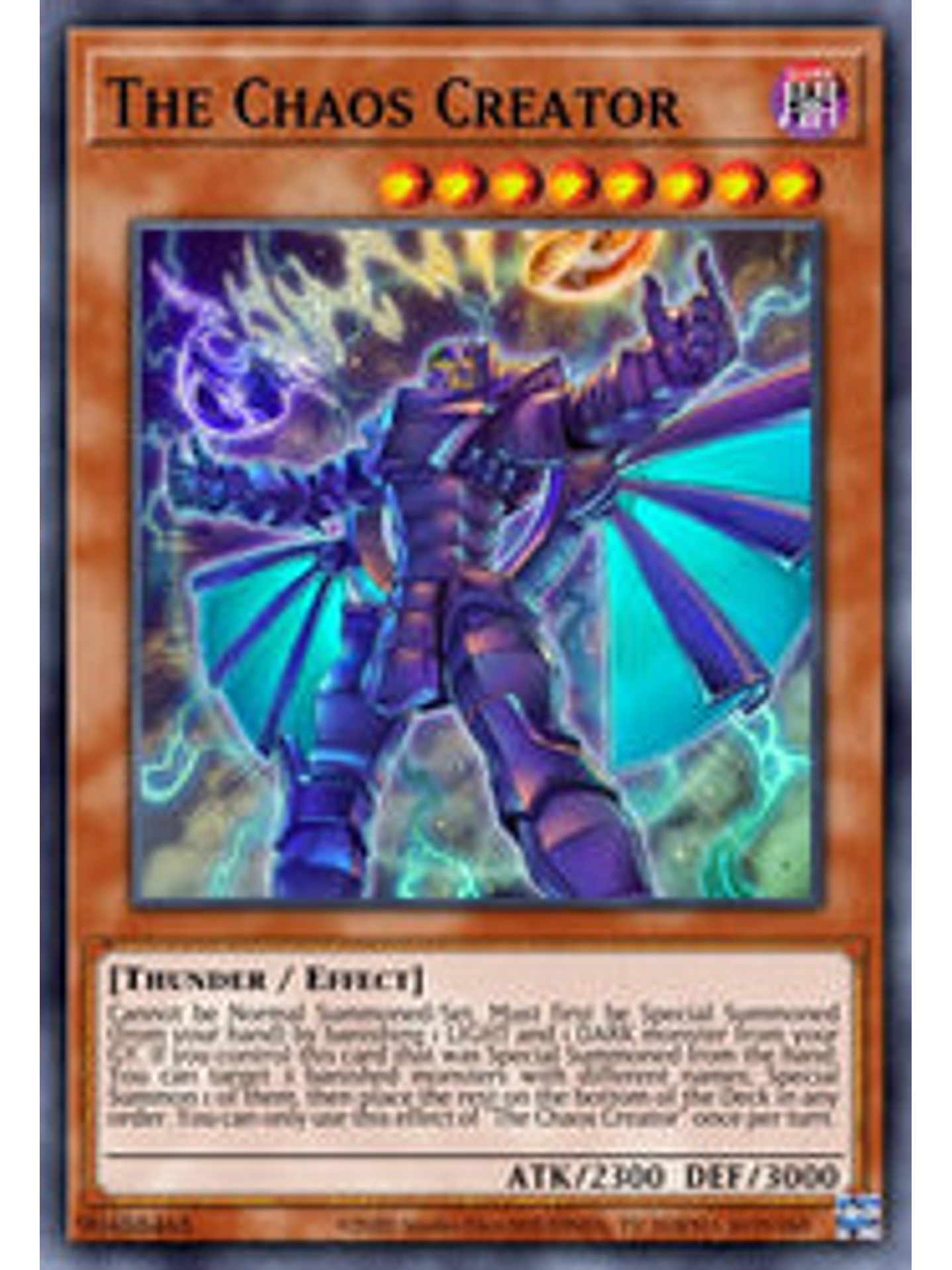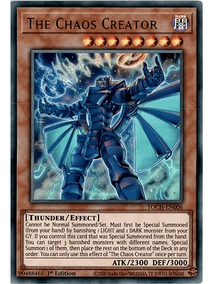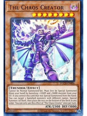 No puede ser Invocado de Modo Normal/Colocado. Debe ser primero Invocado de Modo Especial (desde tu mano) desterrando 1 monstruo de LUZ y 1 monstruo de OSCURIDAD en tu Cementerio. Si controlas esta carta que fue Invocada de Modo Especial desde la mano: puedes seleccionar 3 monstruos desterrados con nombres diferentes; Invoca 1 de ellos de Modo Especial, y después pon el resto en el fondo del Deck en cualquier orden. Sólo puedes usar este efecto de "El Creador del Caos" una vez por turno.