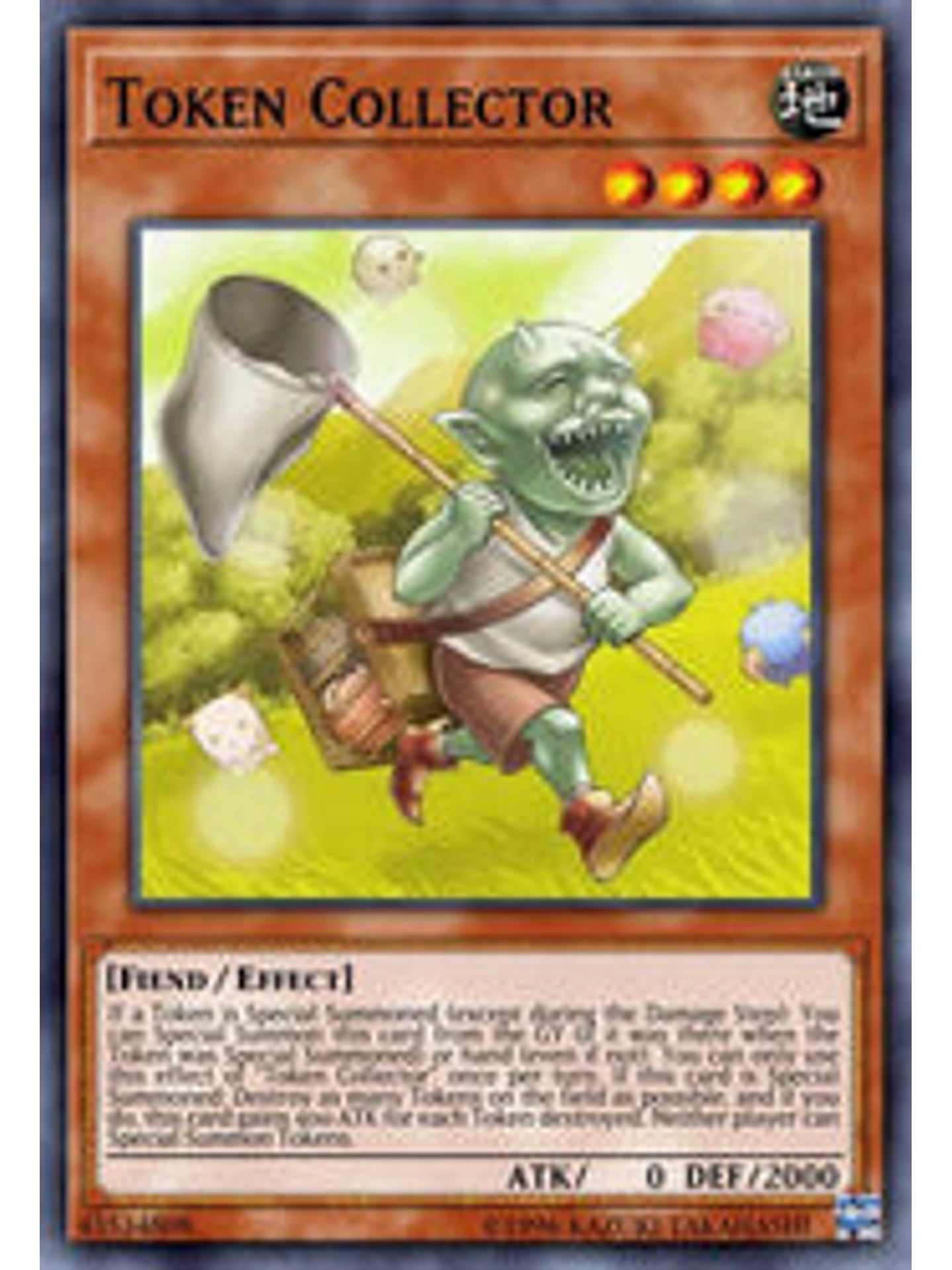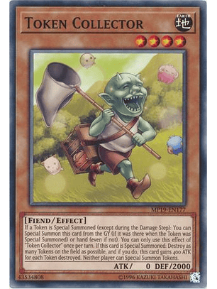 Si una Ficha es Invocada de Modo Especial (excepto durante el Damage Step): puedes Invocar esta carta de Modo Especial desde el Cementerio (si estaba ahí cuando la Ficha fue Invocada de Modo Especial) o mano (aun si no lo hacía). Sólo puedes usar este efecto de "Coleccionista de las Fichas" una vez por turno. Si esta carta es Invocada de Modo Especial: destruye tantas Fichas en el Campo como sea posible y, si lo haces, esta carta gana 400 ATK por cada Ficha destruida. Ningún jugador puede Invocar Fichas de Modo Especial.
