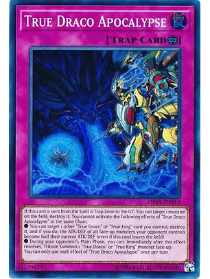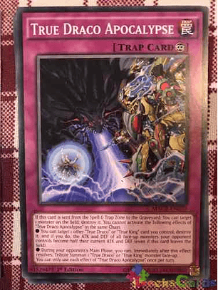 Si esta carta es mandada de la Zona de Magia y Trampas al Cementerio: puedes seleccionar 1 monstruo en el Campo; destrúyelo. No puedes activar los siguientes efectos de "Apocalipsis del Verdadero Draco" en la misma Cadena.● Puedes seleccionar otra carta "Verdadero/a Draco" o "Rey Verdadero" que controles; destrúyela y, si lo haces, el ATK/DEF de todos los monstruos boca arriba que controle tu adversario se convierten en la mitad de su ATK/DEF en este momento (aún si esta carta deja el Campo).● Durante la Main Phase de tu adversario, puedes: inmediatamente después de que se resuelva este efecto, Invocar por Sacrificio 1 monstruo boca arriba "Verdadero/a Draco" o "Rey Verdadero".Sólo puedes usar cada efecto de "Apocalipsis del Verdadero Draco" una vez por turno.