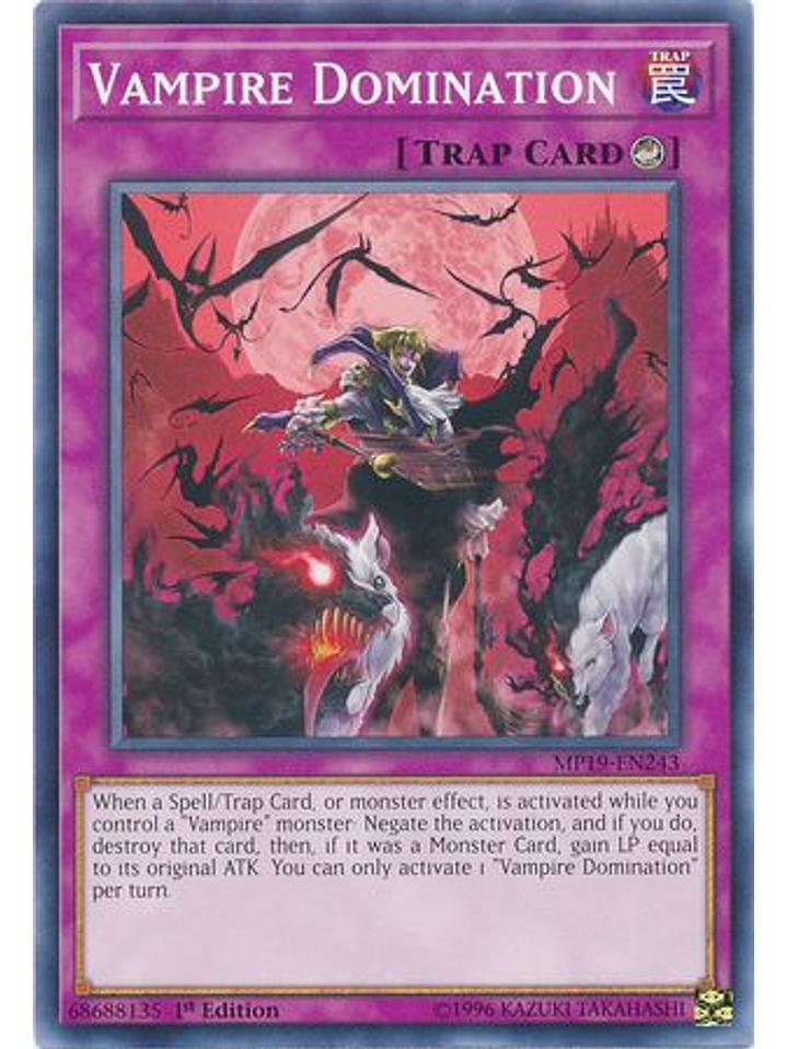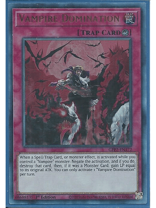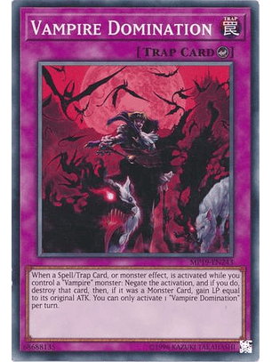 Cuando es activada una Carta Mágica/de Trampa, o efecto de monstruo mientras controlas un monstruo "Vampiro/a": niega la activación y, si lo haces, destruye esa carta, y después, si ésta era una Carta de Monstruo, gana LP igual a su ATK original. Sólo puedes activar 1 "Dominación del Vampiro" por turno.